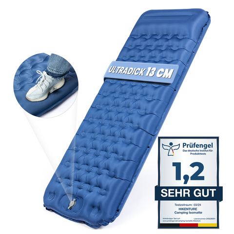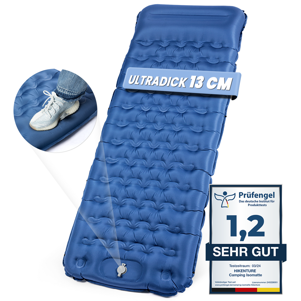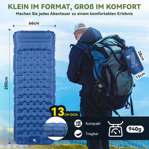 HIKENTURE Sleeping Pad 13CM Ultra-Thick Sleeping Pad Camping with Pillow, Inflatable Air Mattress Small Pack Size, Ultralight Sleeping Mat with Foot Pump for Outdoor, Hiking, Tent - Blue