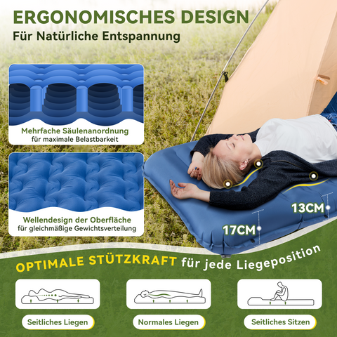 FIRST-CLASS SUPPORT WITH 13CM THICKNESS - The innovative wave structure on the surface and the internal support construction ensure that your spine is optimally supported, even with a maximum load capacity of 300kg. The 13cm thick sleeping mat protects you from cold ground and hard stones. The ergonomic 17 cm pillow area guarantees additional comfort for a restful night's sleep.