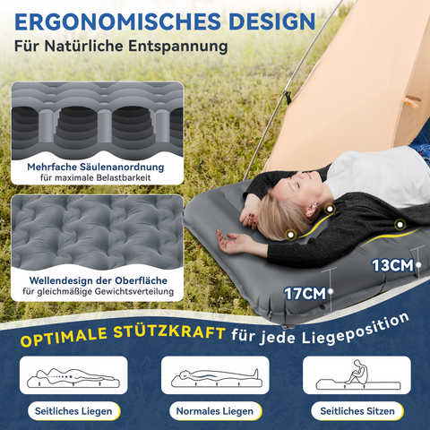 FIRST-CLASS SUPPORT WITH 13CM THICKNESS - The innovative wave structure on the surface and the internal support construction ensure that your spine is optimally supported, even with a maximum load capacity of 300kg. The 13cm thick sleeping mat protects you from cold ground and hard stones. The ergonomic 17 cm pillow area guarantees additional comfort for a restful night's sleep.